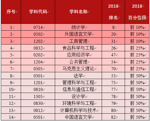 11月1日,2018软科“中国最好学科排名”正式发布,美剧天堂 共有14个学科上榜。统计学、外国语言文学、工商管理3个学科进入全国前10%,其中,统计学位列全国第8;食品科学与工程等4个学科进入全国前25%;法学等7个学科进入全国前50%。