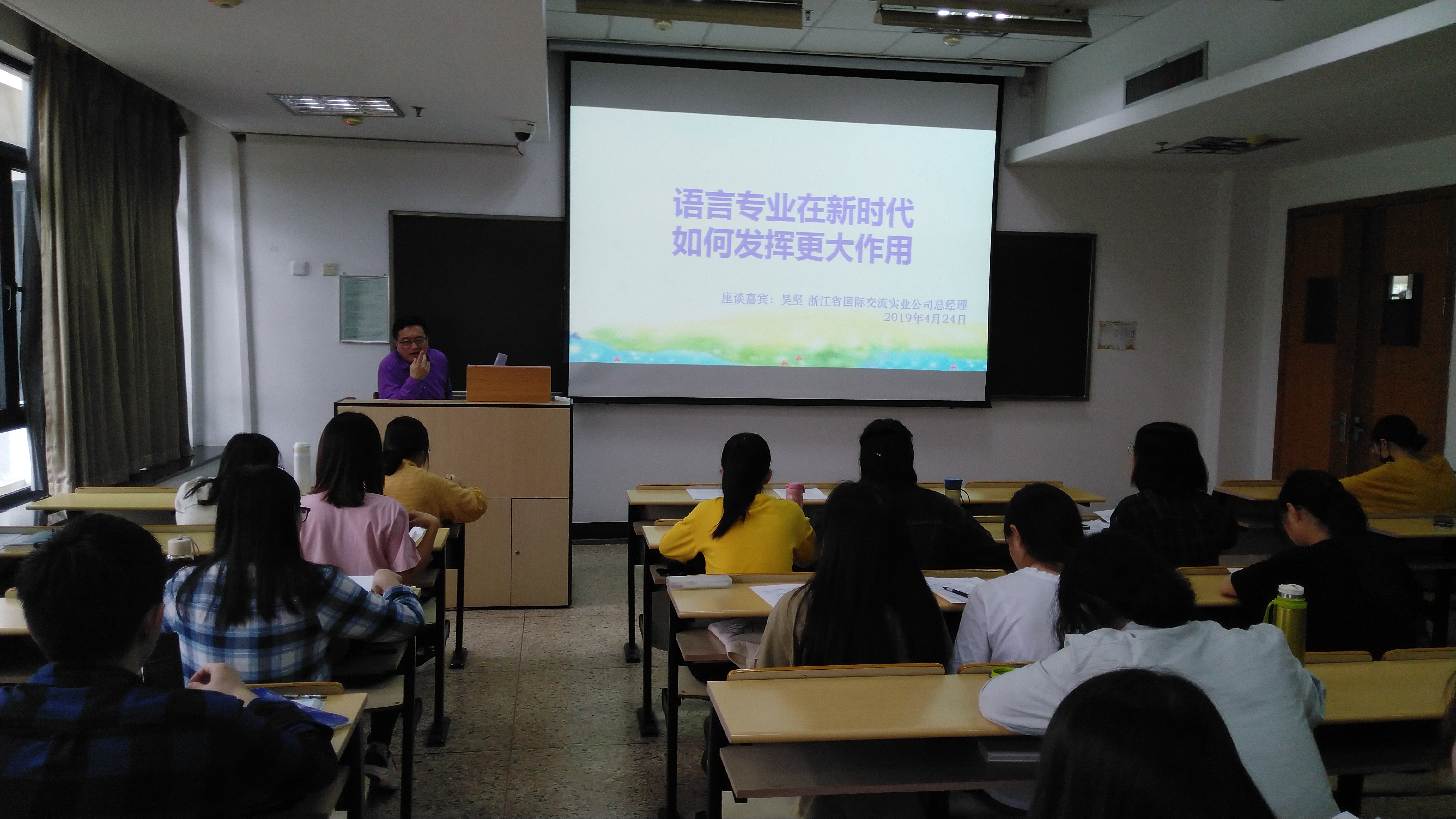 4月24日,浙江省国际交流实业公司吴坚总经理在教学楼A413与美剧天堂 日语16011602班级同学开展了一次主题为“语言专业在新时代如何发挥更大作用”的实务导师座谈会。美剧天堂 张晓东老师参与了本次座谈会。