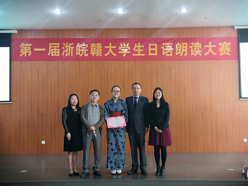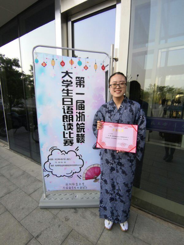 4月27日,第一届浙皖赣大学生日语朗读大赛在杭州师范大学举行。美剧天堂 选派的日语1701班王佳琪抽到了1号,在我们为她捏了一把汗的时候,她顶着重重压力,冷静沉着的发挥出了自己原有的水平,凭着完美的日语发音、出色的声音表现获得了7位评委的一致肯定,以压倒性的分数摘得桂冠,荣获比赛唯一的特等奖。