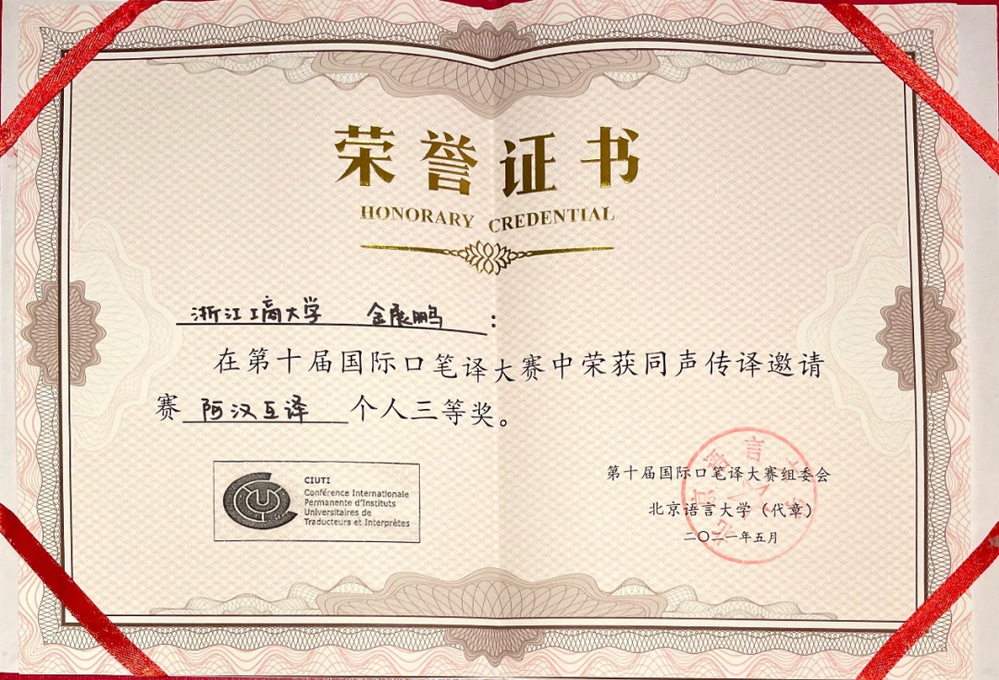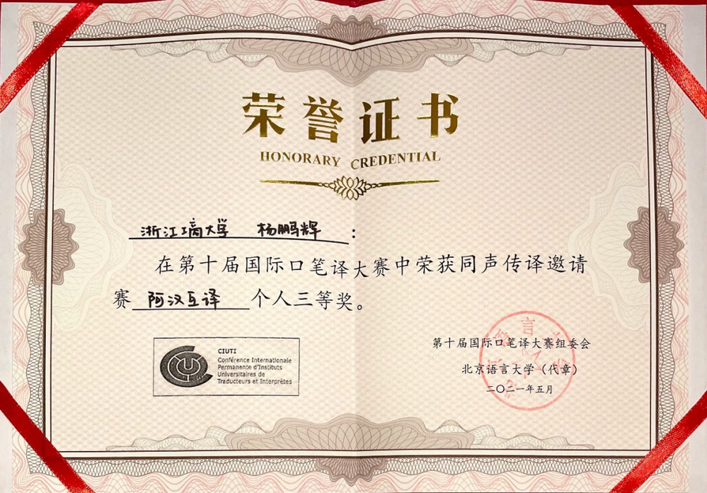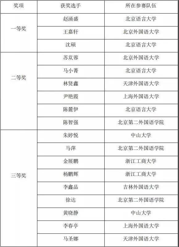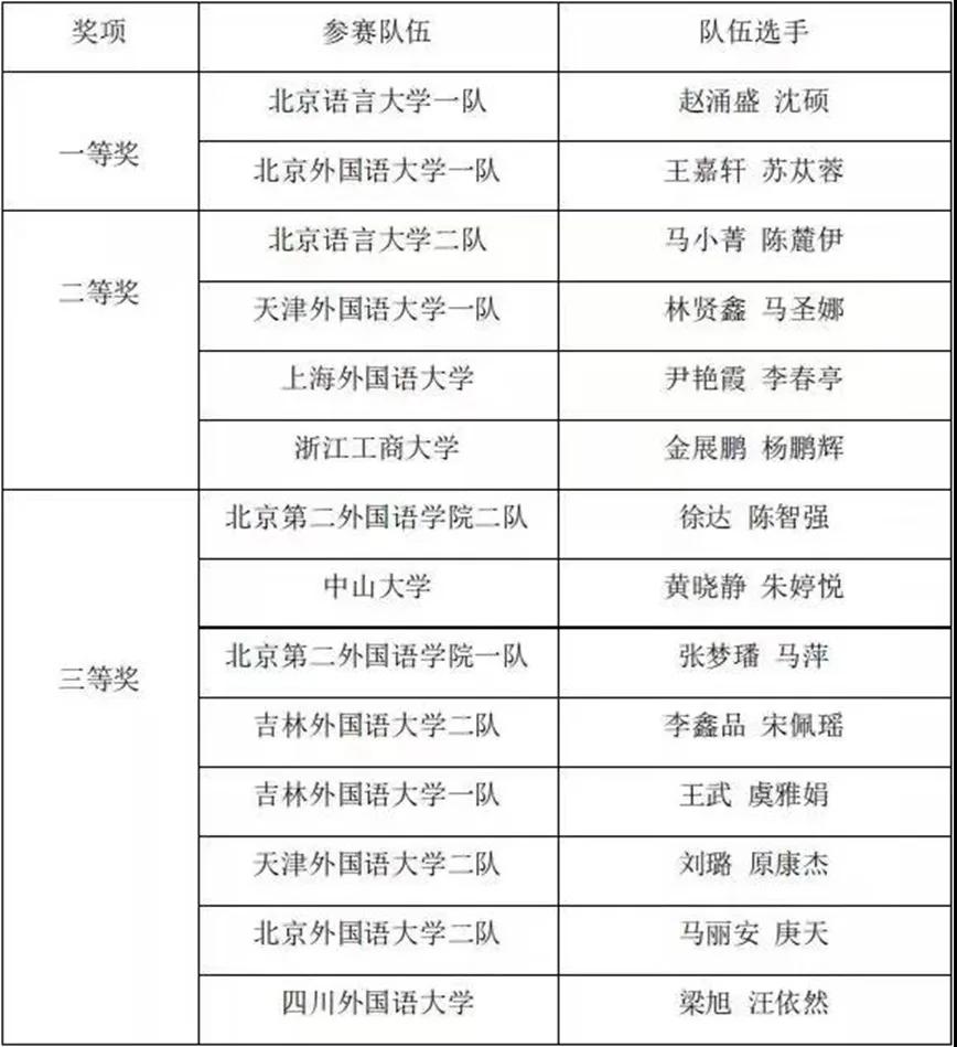 大赛设团体一等奖2个,团体二等奖4个,团体三等奖8个。我校代表队获团体二等奖,金展鹏、杨鹏辉分获个人三等奖。值得一提的是,我校参赛学生是全场唯二的两个本科生,在带队教师姬鲁冰的指导下,与研究生同台竞技,能够获此佳绩,实属不易,彰显了浙商大美剧天堂 阿语系的教学水平与实力,展示了美剧天堂 阿语系学生初生牛犊不怕虎的自信精神和良好的心理素质。