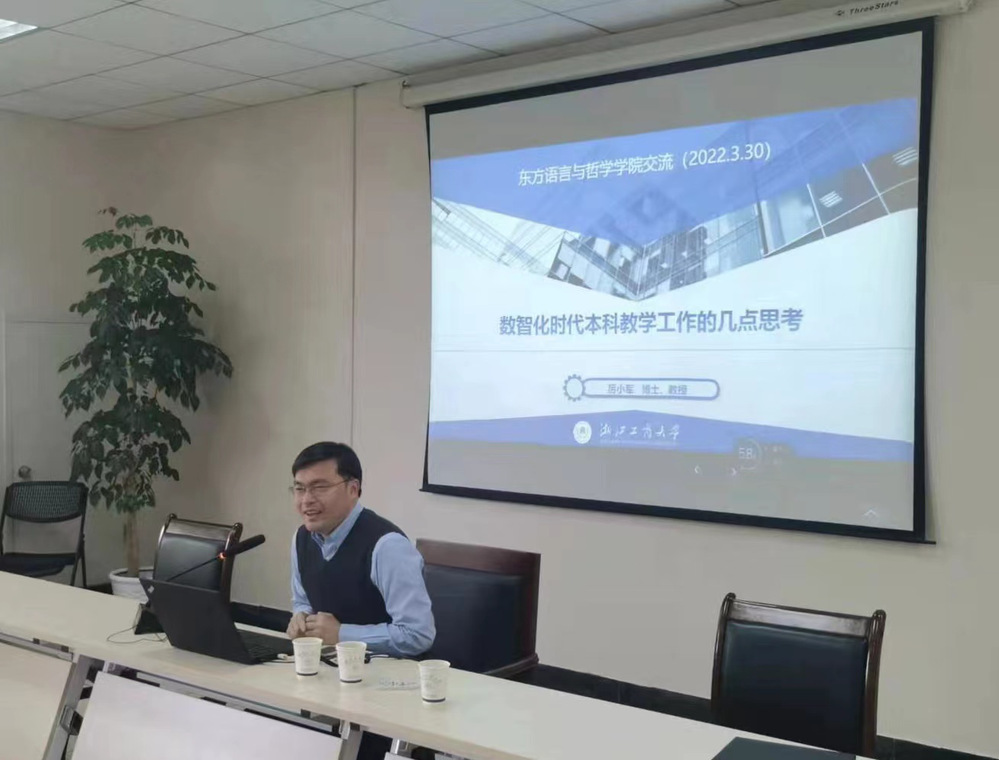 3月30日下午,校教务处处长厉小军教授受邀来美剧天堂 作了题为“数智化时代本科教学工作的几点思考”的讲座,美剧天堂 江静院长、董科副院长及日语系、阿拉伯语系、哲学系教师三十余人到场聆听。