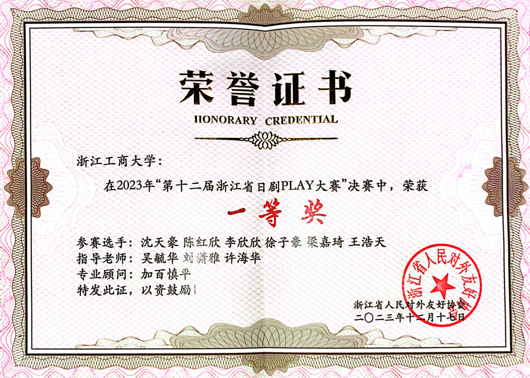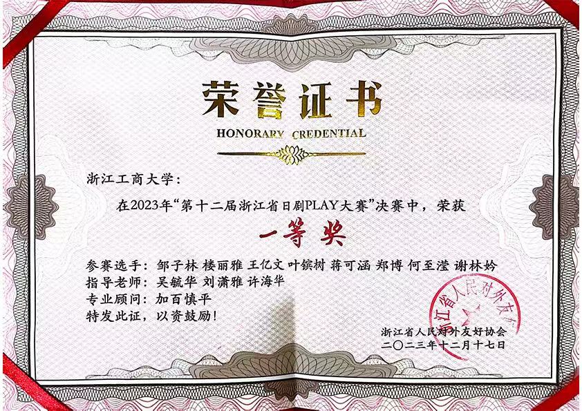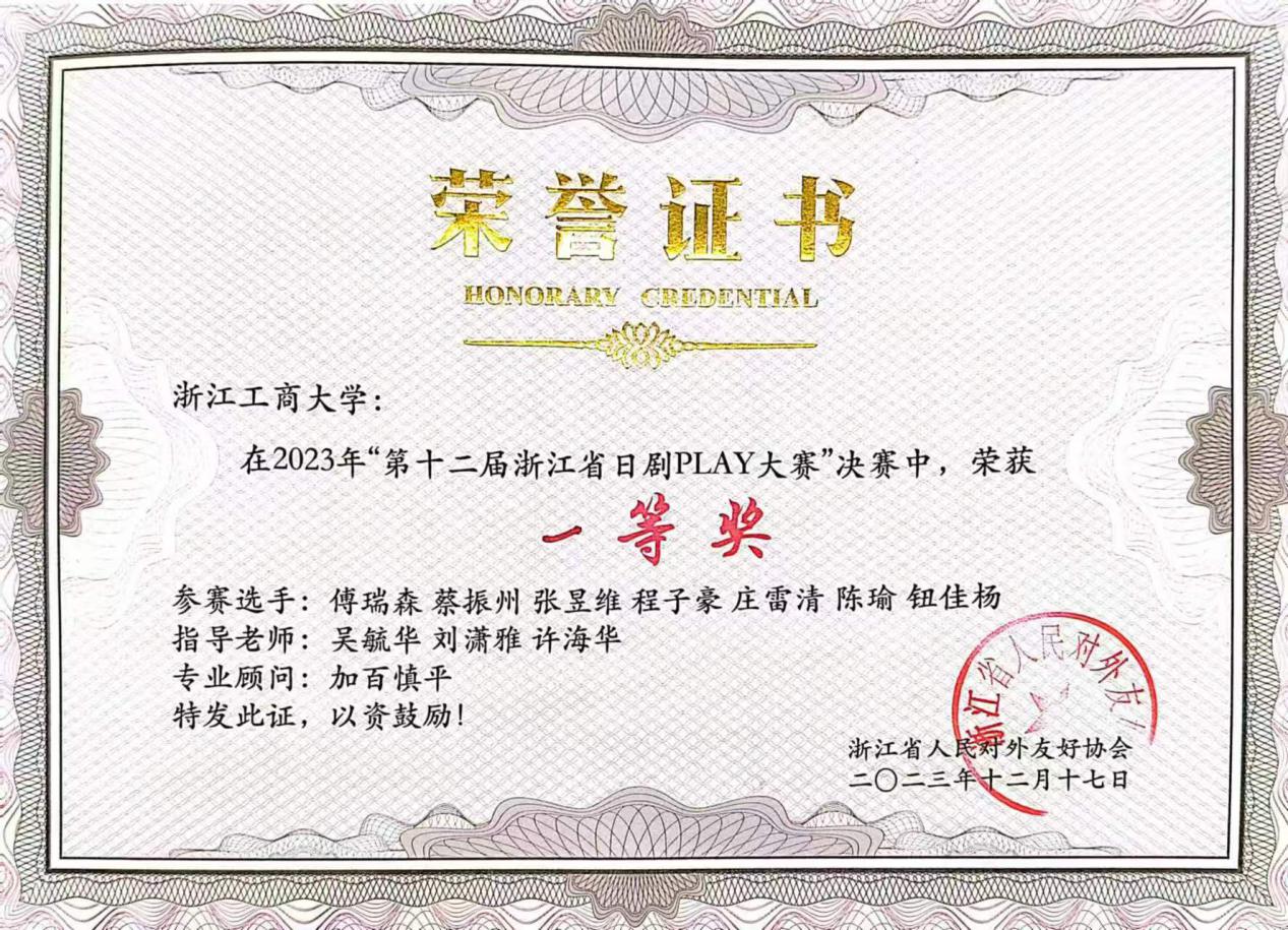 2023年12月,由浙江省人民对外友好协会、日本静冈县日中友好协会主办,美剧天堂 、浙江外国语学院东方语言文化学院承办,日本国际交流基金“心连心”项目、中国日语教学研究会浙皖赣分会、美剧天堂 和风日语协会、浙江外国语学院梦之声日本文化研究协会协办,上智大学中国办事处(日中文化交流中心)、日本致远教育进学塾、樱花国际日语后援的“第十二届浙江省日剧play大赛”经过现场评比,圆满结束。